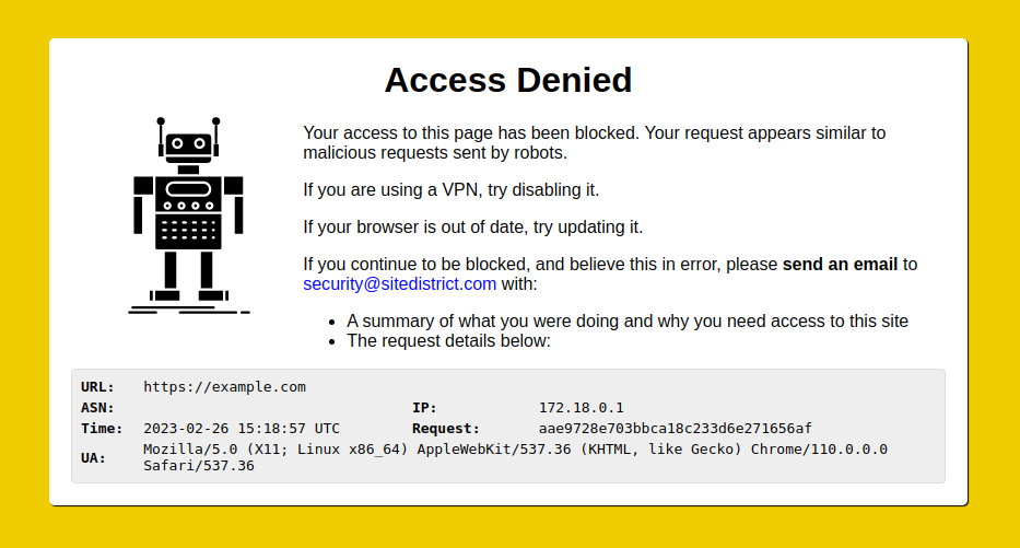 The SITE DISTRICT protects sites hosted on our platform by analyzing requests sent to our servers and blocking those that are known to be malicious, as well as requests that are similar in some way to those made by bots which often cause problems with sites if they are not stopped. You can read more about our firewall here.
