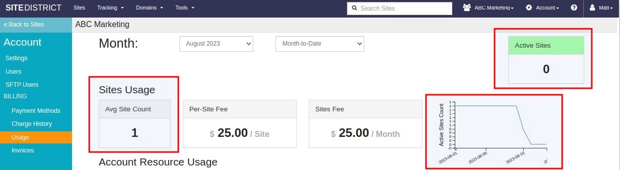 Once a site is taken offline in one of the ways described above, your Active Sites count will drop, as found on the Usage page under the Account menu.