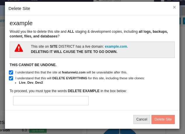 If your site is live, you will need to confirm the effects of deleting the site by checking the checkboxes in the dialog, and typing the required text as shown: