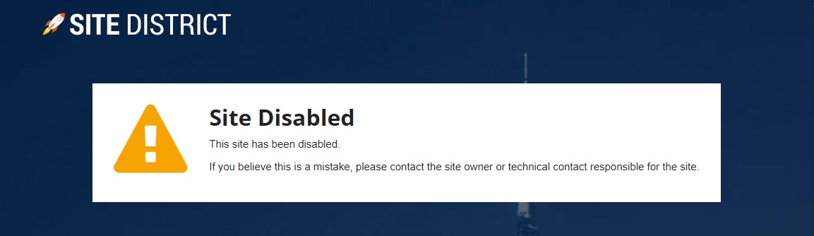 Once disabled, the default SiteDistrict Site Disabled page will be shown to visitors: