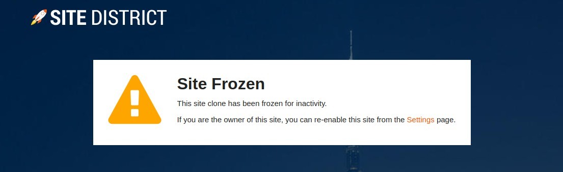 When a site is Frozen, both PHP and MySQL are turned off for the site, and anyone trying to access the site will see a Site Frozen page: