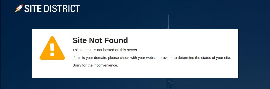 Once the domain is removed from the site, and as long as your DNS records still point the domain at SiteDistrict, visitors will see a Site Not Found page if they attempt to access the site or any pages on ths site: